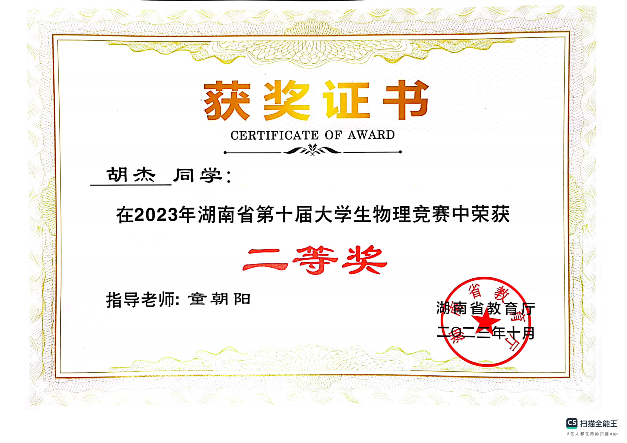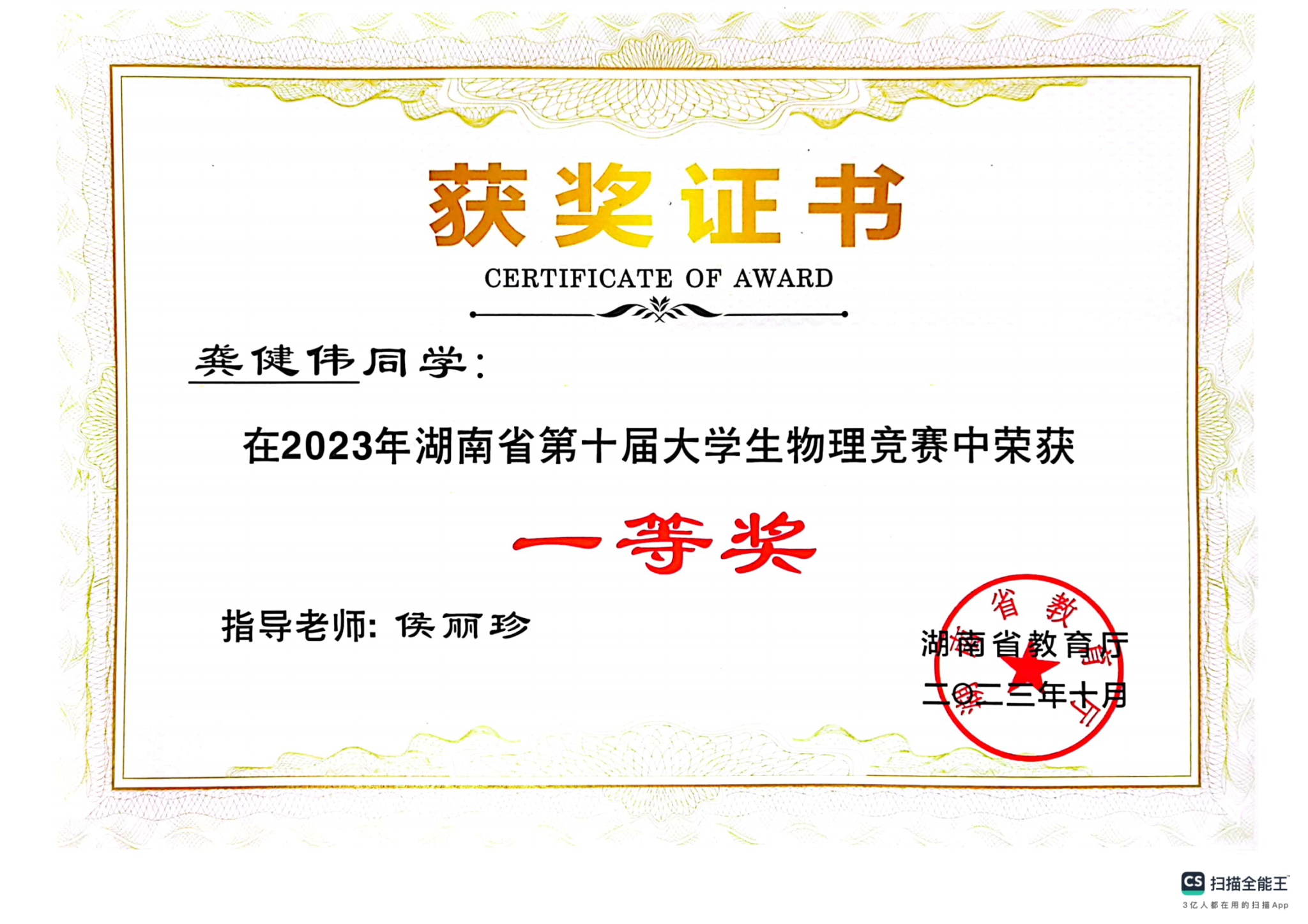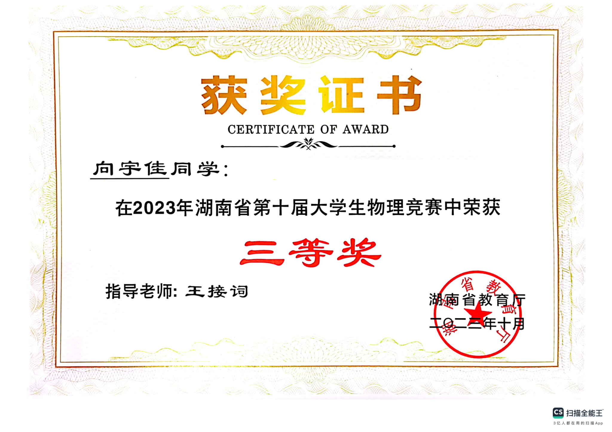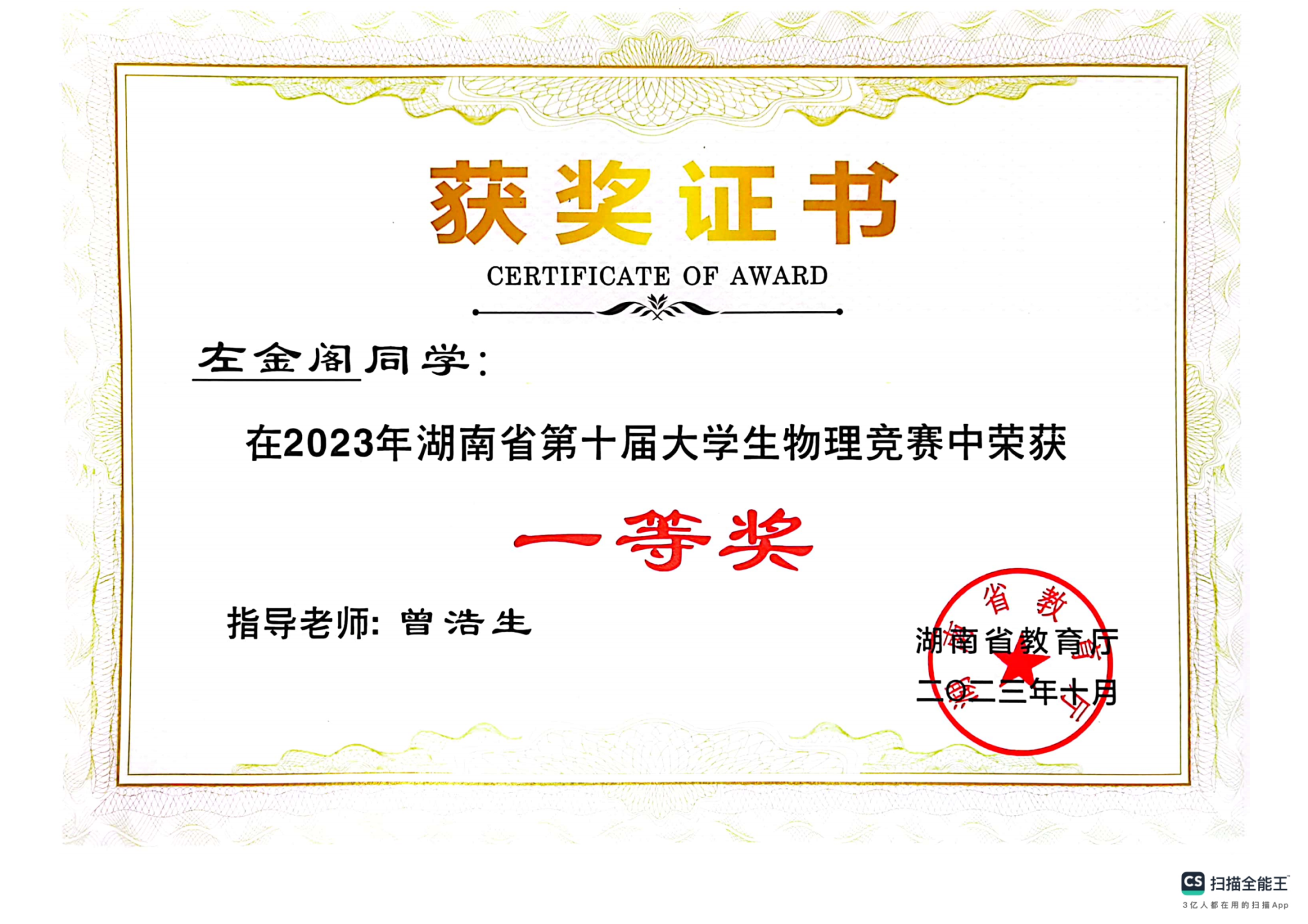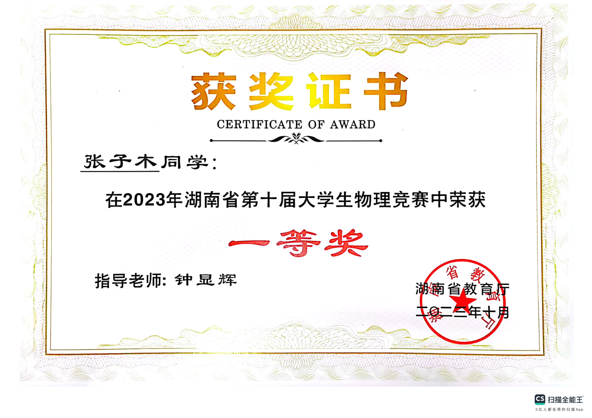 2023年湖南省第十届大学生物理竞赛获奖