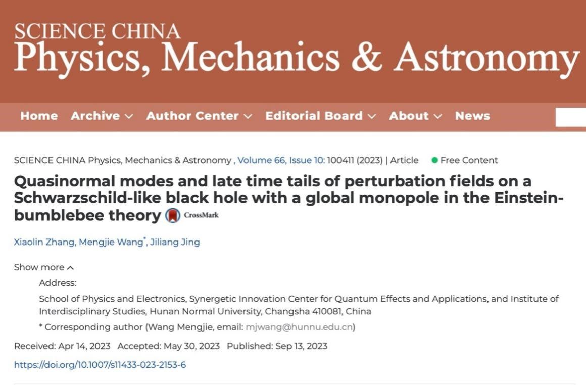 近日,william威廉中文官网王梦杰副教授与荆继良教授课题组针对Einstein-bumblebee理论中含整体单极子的静态球对称黑洞在任意自旋场(标量场/狄拉克场/电磁场)扰动下的动力学行为进行了研究,相关成果以“Quasinormal modes and late time tails of perturbation fields on a Schwarzschild-like black hole with a global monopole in the Einstein-bumblebee theory”为题在《SCIENCE CHINA Physics, Mechanics & Astronomy》上发表。