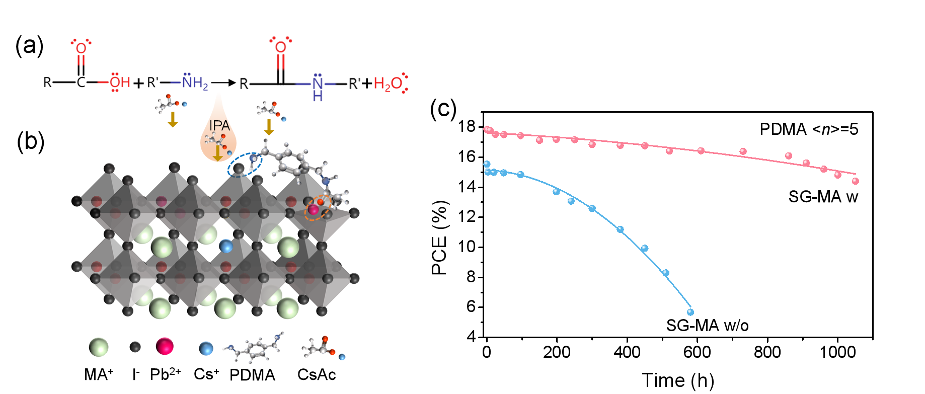 图1.乙酸铯诱发的缩聚反应(a)及其缺陷钝化和组分重构示意图(b),(PDMA)MA4Pb5I16基准二维钙钛矿太阳能电池在光照(1个太阳)和高温(85℃)下的PCE随时间变化曲线(c)