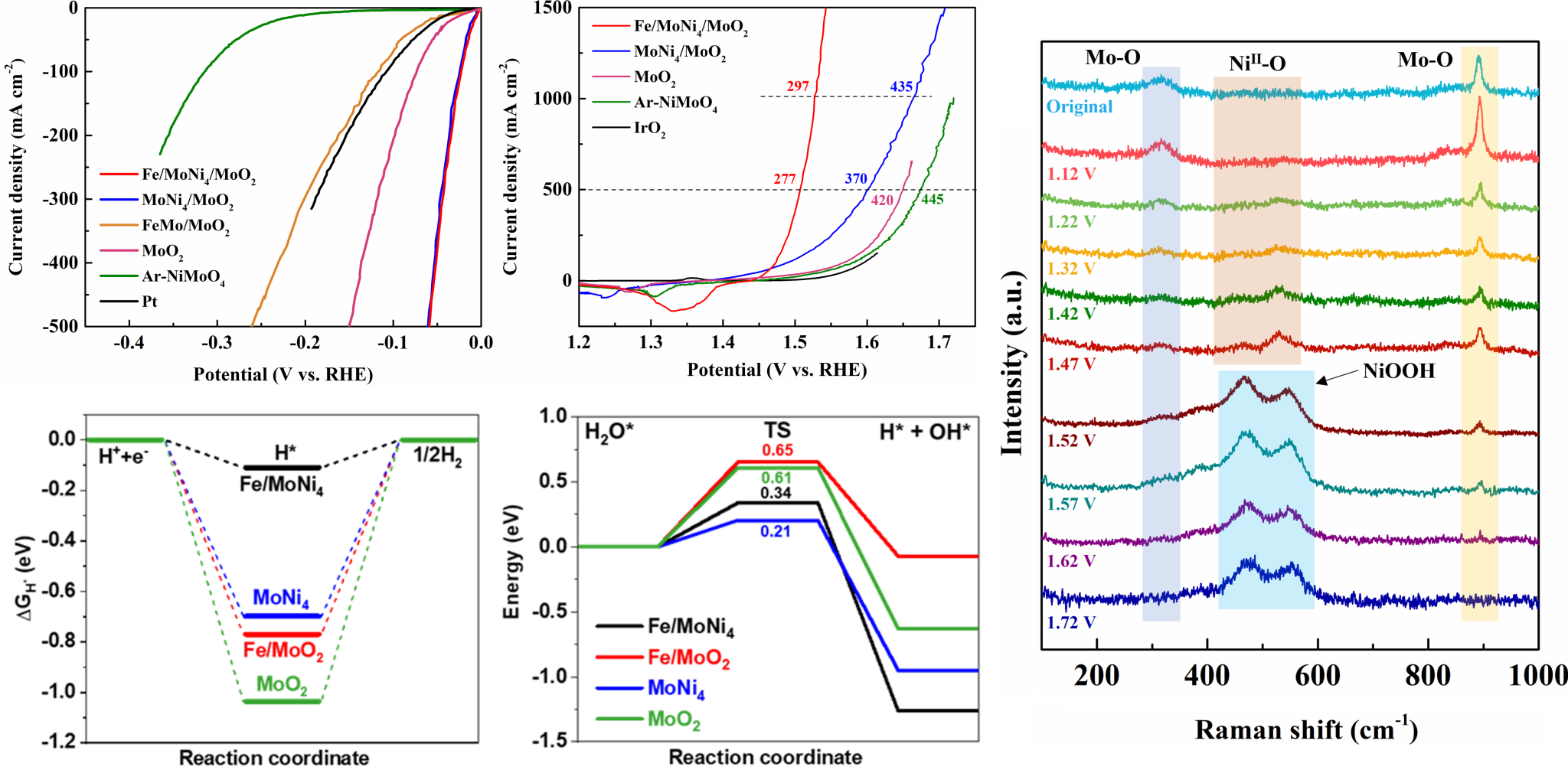 针对上述问题,该团队通过在金属间化合物MoNi4表面原位锚定铁颗粒的策略,开发出一种多金属位点接力催化的Fe/MoNi4/MoO2双功能电解水催化剂。MoNi4促进初始的水吸附/解离步骤,Fe/MoNi4加快后续的氢吸附步骤,而表面重构形成的Ni1-xFexOOH则主要促进水氧化步骤,进而显著降低全解水反应过程中涉及的多个决速步骤的能垒。该催化剂在碱性环境中表现出优异的双功能活性和大电流密度下的长期稳定性,分别仅需要59mV和277mV的析氢和析氧过电位就能产生500mA/cm2的工业级电流密度,其性能优于绝大多数非贵金属催化剂。将其耦合成全解水器件,该器件仅需要1.64 V的槽压就能产生安培级电流密度1000 mA/cm2,且在大电流密度500 mA/cm2稳定运行200小时以上。在此基础上,团队利用原位X射线光电子能谱、原位拉曼光谱和密度泛函理论计算解析了催化剂中多级界面之间的协同催化效应以及多金属位点的协同接力催化机制。该研究为开发工业级双功能电解水催化剂提供了技术指导。