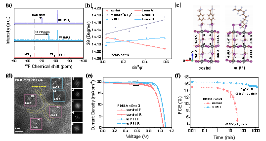 图1.(a)PFI及与不同碘化合物作用后的19F核磁谱。(b)PFI及[BMP]+[BF]-调节(PDMA)MA4Pb5I16基钙钛矿后的晶格应力。(c)计算的垂直于b轴的Pb-I框架平面微观结构图。(d)PFI在晶界处自组装的TEM图。(PDMA)MA2Pb3I10基准二维钙钛矿太阳电池的(e)J-V曲线和(f)反向偏压下PCE随时间变化曲线。