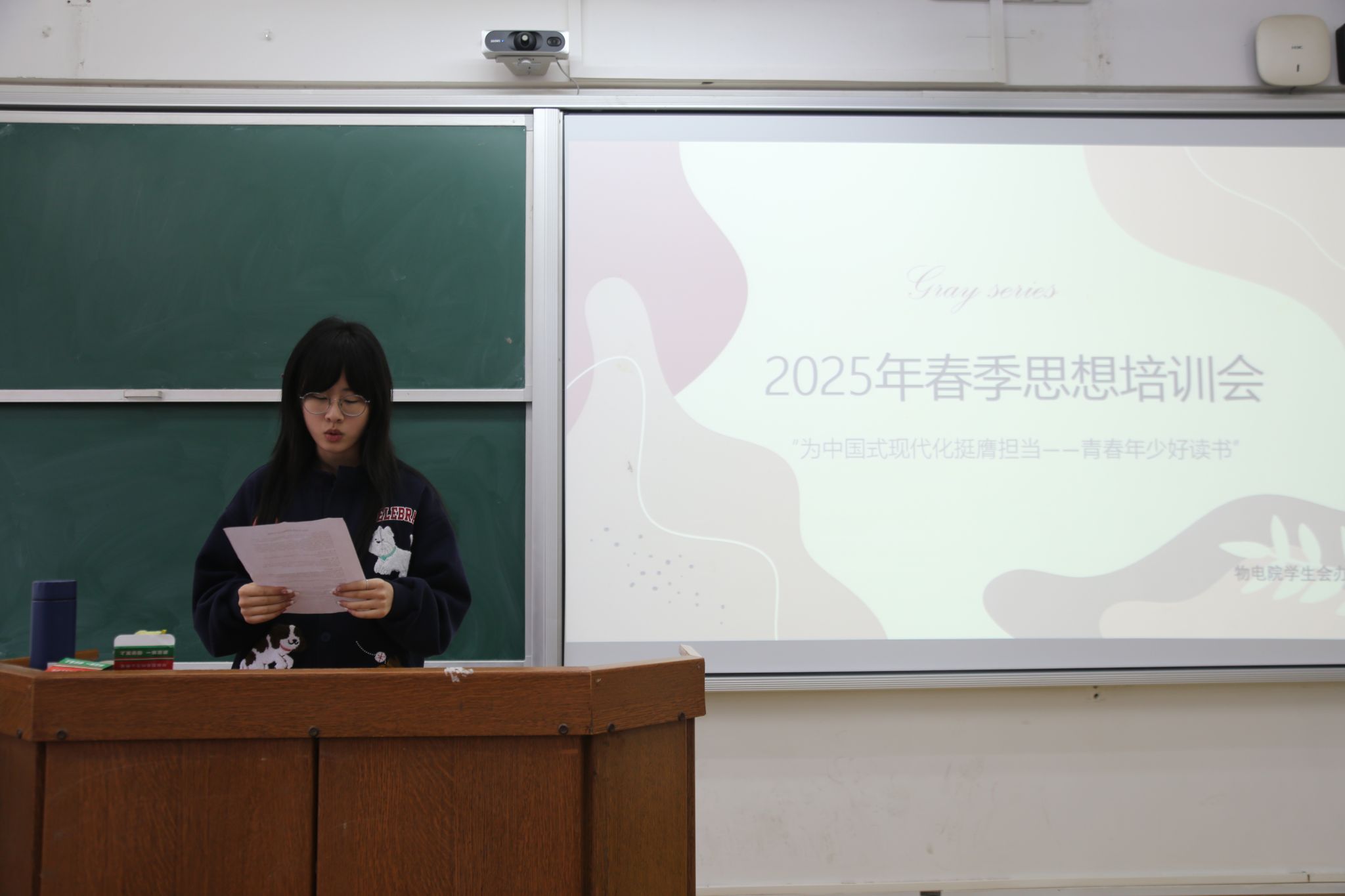 此次会议主题是“为中国式现代化挺膺担当——青春年少好读书”。戴文纯借助PPT,对《习近平与大学生朋友们》一书展开了全面且深入的介绍,带领同学们共同学习了该书节选段落,强调青年大学生要牢记习近平总书记的殷殷嘱托,要有自找苦吃的精神。她鼓励同学们坚定理想信念,树立正确的甜苦观,坚持奋斗,勇于担当,在努力学习的同时积极参加社会实践活动。在读书感悟分享环节,两位学生代表分别从“坚持勤奋学习”与“培养品德修养”两方面谈了自己阅读书籍的感悟,也呼吁同学们成为德智体美劳全面发展的社会主义接班人,为中华民族的伟大复兴做贡献。