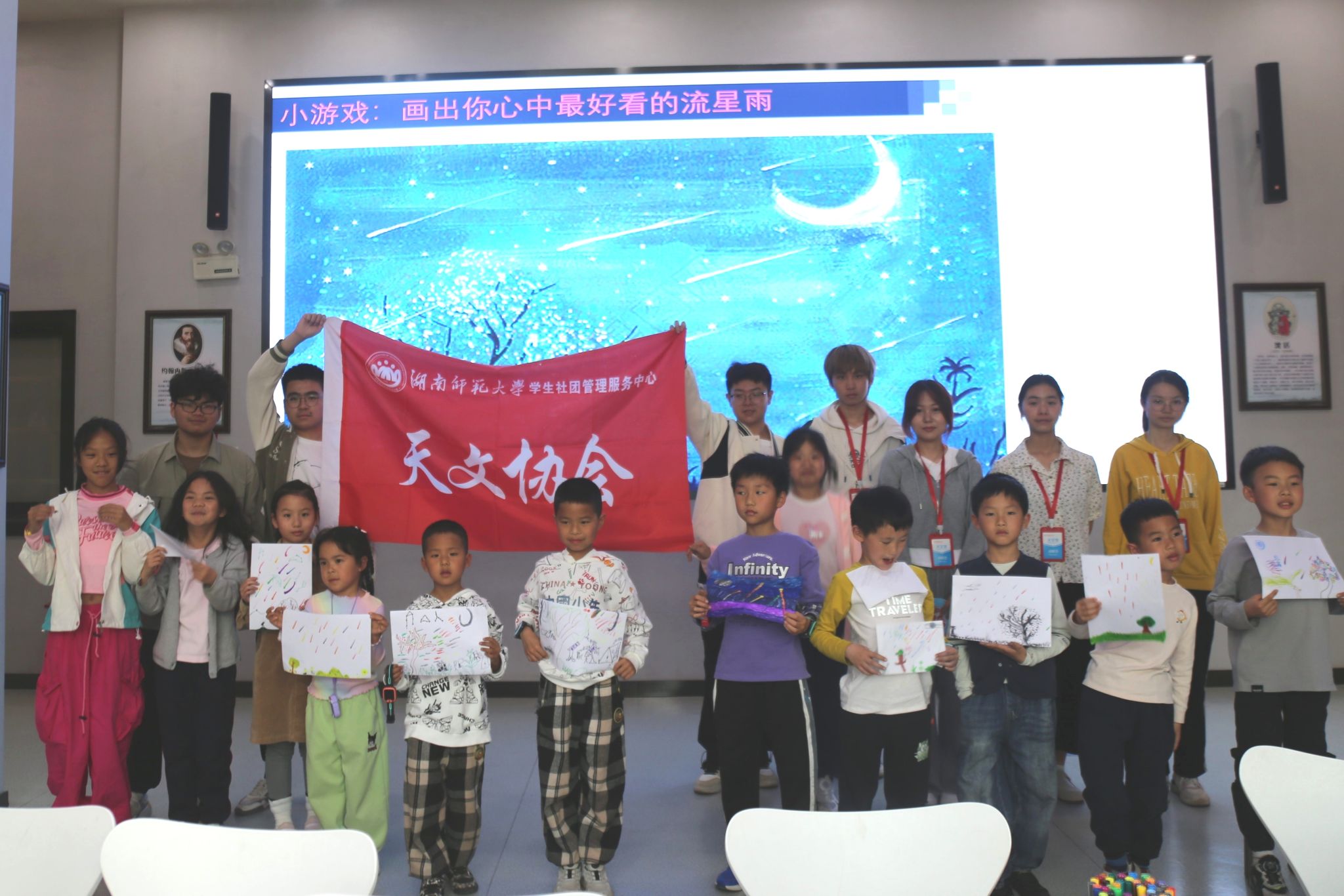 孟鸿靖通过生动的图片与视频,为小朋友们讲解了流星的概念,详细介绍了流星的成因、运动轨迹及其与陨石的区别,并通过互动问答帮助小朋友们深入理解宇宙奥秘。随后,志愿者们分发画笔,引导小朋友们发挥想象力,描绘出自己心目中的流星。小朋友们专注地进行绘画创作,完成了多幅以流星为主题的画作。在展示环节,参与者依次上台介绍自己的作品,交流创作思路,活动现场互动积极。