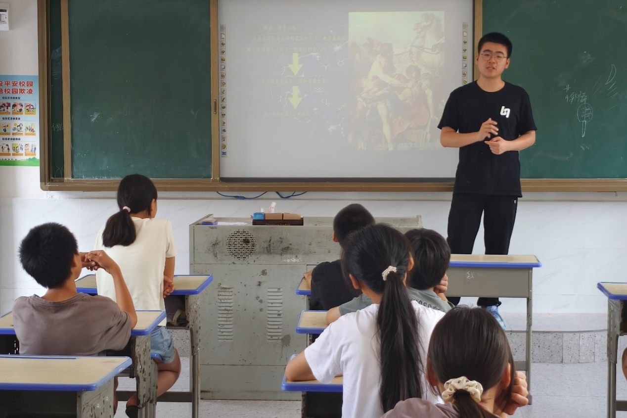 (通讯员 田恬 陈意 邓湘源)7月6日上午,william威廉中文官网“星野寻光”社会实践团成员孟鸿靖、张晏齐在永州市双牌县打鼓萍乡小学分别讲授“流星”和“星座与传说”主题课程。