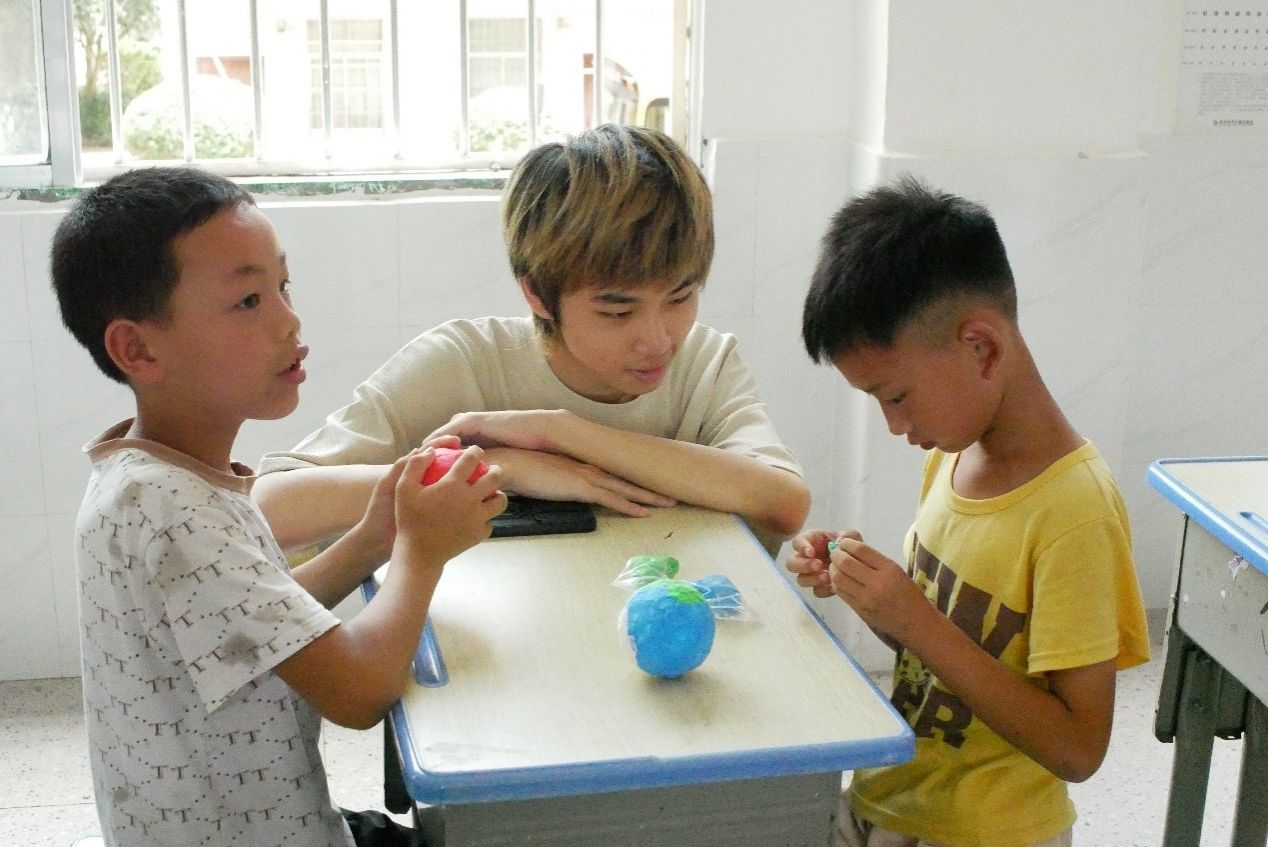 主讲人以“太阳系八大星球的组成成分”为切入点,同时结合《小王子》中的“玫瑰星球”故事,给孩子们讲解构成星球的经典元素,如坑洼表面、主要地形和特定生物等。正式动手制作前,主讲人通过图文演示和实物模型展示的方式,介绍了“制作一颗星球”的具体步骤,并由实践团成员向小朋友们分发粘土、泡沫球基材等制作材料。手工实践过程中,孩子们在实践团成员的帮助下确定了星球的代表颜色,他们通过彩色粘土制作出星球地形与生物,逐步完成星球的内核打造和表面布置,并为自己的星球命名。在星球展示环节中,孩子们依次上台主动分享自己的作品,包括行星名称、设计特点以及设计思路。
