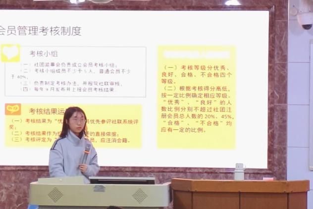 见面大会伊始,主讲人借助PPT回顾了阳光教育协会的发展历程。她从协会的创立背景开始,梳理了历年来的重要节点,并解读了“以教育传递温暖,以行动践行公益”的宗旨。为让新会员感受社团活力,主讲人展示了社团过往活动集锦,支教帮扶、校园知识宣讲等画面,展现协会的实践成果。此外,主讲人还介绍了会员管理考核制度,重申了遵守社团章程、积极参与活动的重要性,引导新会员快速明确参与方向。