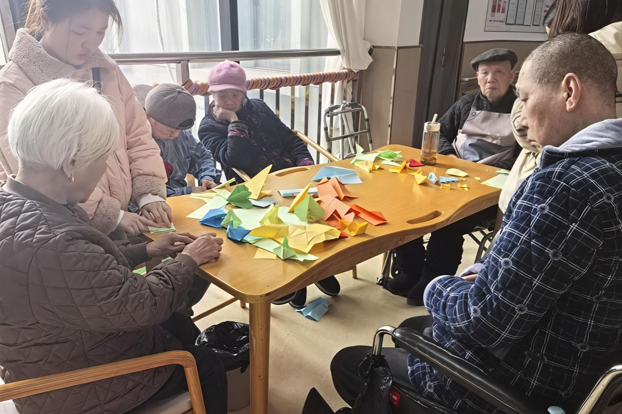 活动期间,志愿者们与老人进行交流,倾听他们讲述人生经历与生活往事。通过对话,志愿者们对老人们有了更深入的了解。在随后的手工互动与陪伴环节中,志愿者们耐心陪伴老人一同折纸,手把手指导折纸技巧,和老人闲话家常,用温暖的话语传递关怀。在志愿者一对一的协助与陪伴下,老人们都顺利完成了手工创作,活动现场洋溢着融洽的气氛,老人们在互动中体验到社会关爱的温度,活动也在温馨的氛围中圆满结束。