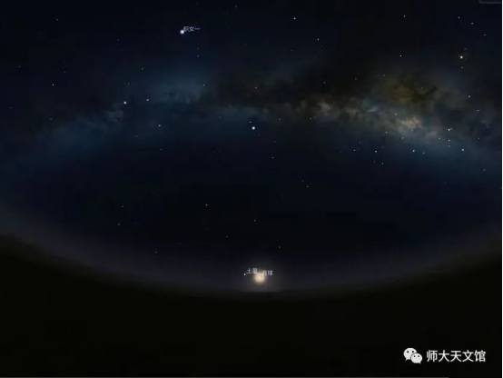 本月土星在午夜时分才从东方地平升起,随着时间推移,它升起的时间也在不断提前,到八月,我们就可以在天黑后的东方低空寻找到它。本月10日0点,月球来到土星附近,此时土星亮度约为0.82等。