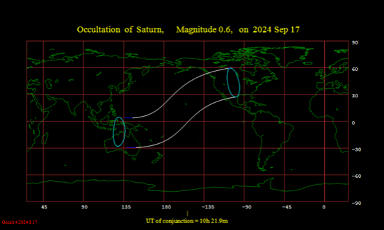 2024年9月17日18:22土星合月(视赤经23h09m23s),地心所见土星在月球以南0.31度的地方,土星视星等0.6等,位于宝瓶座,在太平洋夏威夷群岛可见月掩土星。21点左右仰望东南天空,可以看到圆圆的月亮。就在右上角,可以看到刚过冲日的土星,与月球的间隔只有1.4度,是条件很好的接近。