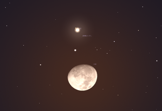 土星在月球以南0.11度。土星是气态巨行星,主要由氢组成,还有少量的氦与少量元素,内部的核心包括岩石和冰,外围由数层金属氢和气体包覆。土星以其美丽的光环而闻名,这些光环主要由冰粒和岩石碎片组成。土星合月为观察者提供了一个绝佳的机会来欣赏土星那独特的光环结构。