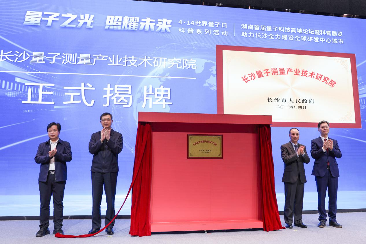 论坛现场,周海兵、国防科技大学校党委常委、科研部部长杨俊、湖南省科技厅副厅长周建元、长沙量子测量产业技术研究院执行院长汪陶胜共同为长沙量子测量产业技术研究院揭牌。