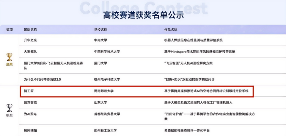 (通讯员 罗子越)12月19日,昇腾AI创新大赛2024全国总决赛在福建厦门成功举办。由我院田海山老师指导的研究生罗子越、李可为、钟子怡、韩宁、覃弘开、秦方源、龙飞扬七位同学完成的项目《基于昇腾底座和渗透式AI的空地协同目标识别跟踪定位系统》顺利通过湖南赛区选拔进入全国总决赛,最终荣获全国赛银奖。
